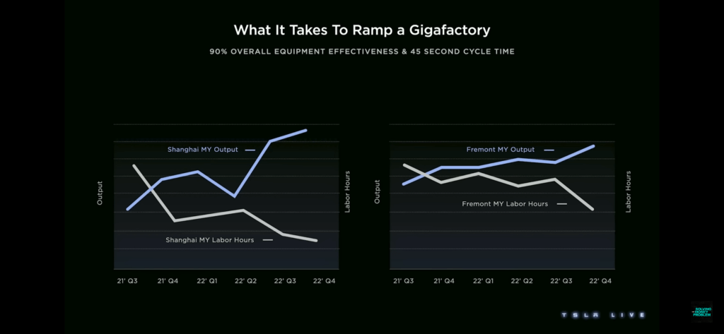 This figure describes the increase in output and decrease in labor for both Shanghai (left) and Fremont (right) gigafactories