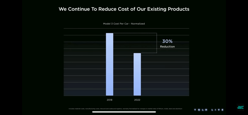 - Model 3 production improvements (2017-2023): ~20% lighter drive unit, 25% less rare Earth metals, 75% smaller powertrain factory, 65% cheaper powertrain factory