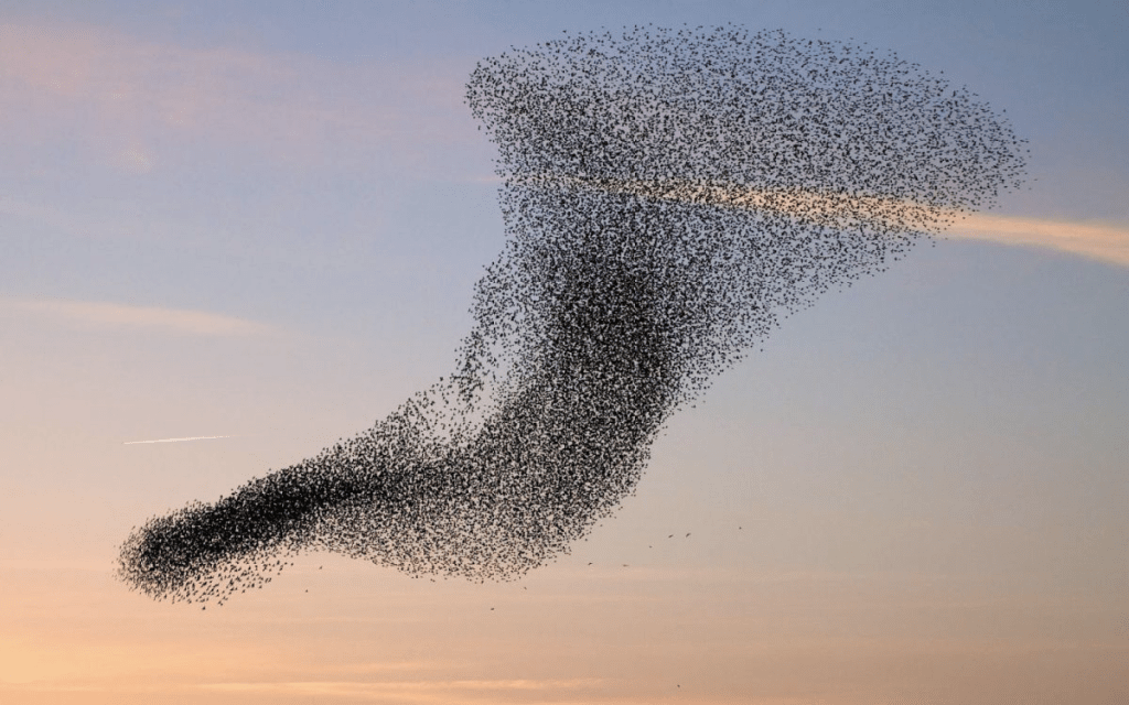 Figure 2(a) and 2(b): (a) depicts a flock of birds and (b) depicts a school of fish. Both groups move as one brain, but independently consume energy; this exhibits the qualities of active matter [21].
